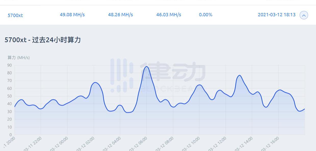 RX5700XT是AMD于2019年7月推出基于RDNA1架構的顯卡,其默認挖以太坊算力為54MH/s,功耗為180W。本次測試通過限制功耗的方式,日均算力約為46MH/s,功耗為110W。