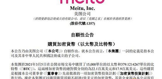 XRP/HKD-2.77%2021年3月7日,美圖公司發布自愿性公告指出,本集團于2021年3月5日在公開市場交易中購買了15,000單位的以太幣和379.1214267單位的比特幣,這兩種加密貨幣的總對價分別約為22.1百萬美元和17.9百萬美元。BTC及ETH購買量共計4000萬美金,約合人民幣2.5億元。