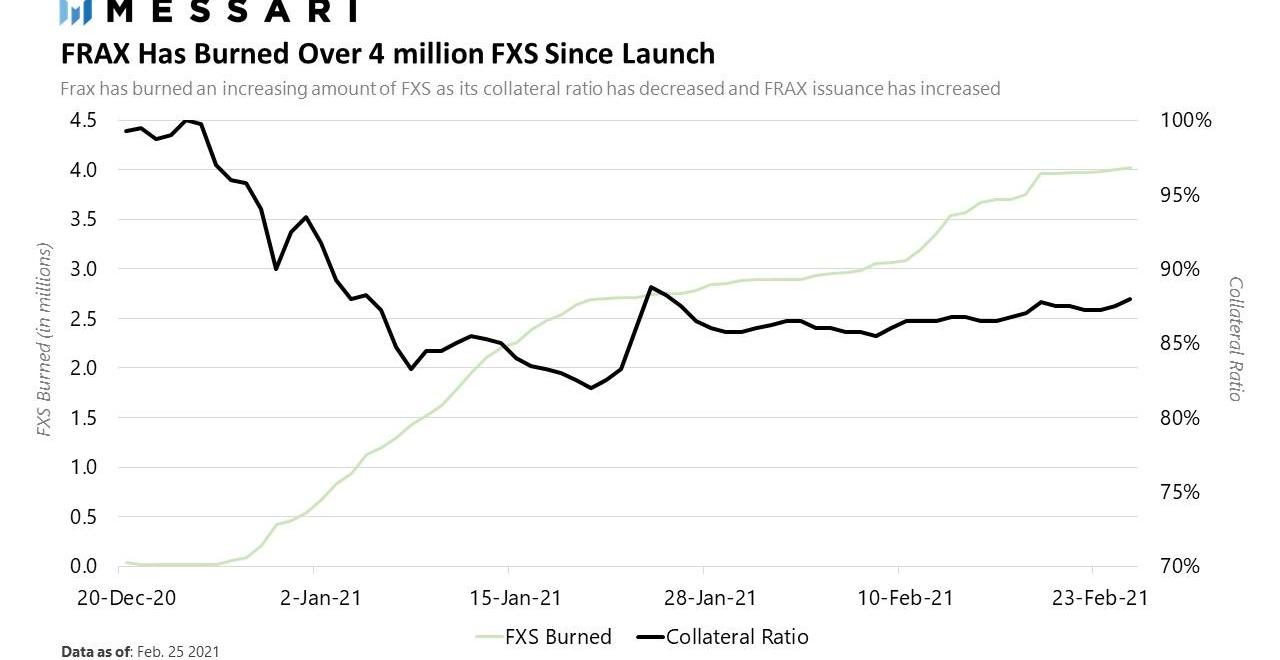 到目前為止,Frax自推出以來已經燒掉了超過400萬臺FXS。以下是抵押物比例隨時間的變化及其對FXS燒毀的影響。