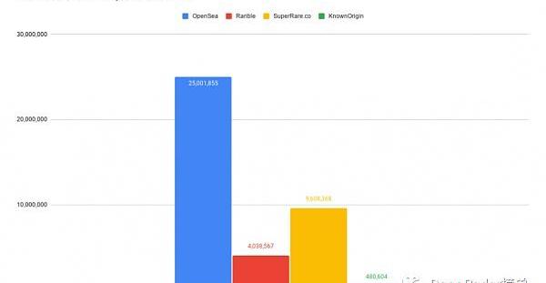 但當查看交易量時,結果則迥然不同。OpenSea在7天內的交易額超過2,500萬美元,處于領先地位。SuperRare的數據為960萬美元,而Rarible以略高于400萬美元的交易量排名第三。?