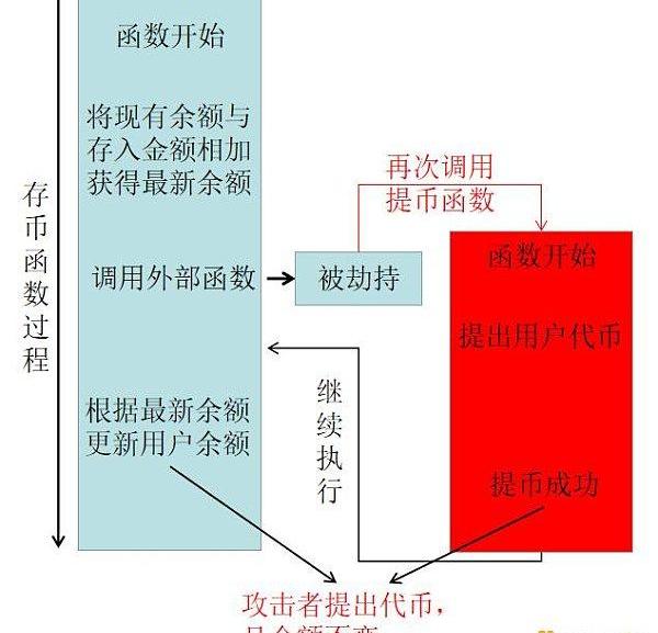 再比如,同樣利用上述方式,若資金轉入合約在調用外部合約之前,將攻擊者的余額存放于變量,則攻擊者就可以在攻擊合約中調用相關余額提取函數,在正常合約執行完畢之前將余額提出,而最后正常合約函數使用之前的余額變量將攻擊者余額進行更新,這就將導致黑客取出了資產,但余額并未改變。攻擊流程如下圖3-1-2。
