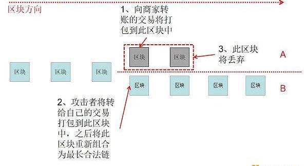51%攻擊指的是攻擊者掌握了全網50%以上的哈希計算算力,擁有超過50%的算力,攻擊者就能修改自己的交易記錄、廢棄其余礦工開采的區塊、阻止交易確認等行為。例如,攻擊者花費一筆虛擬貨幣購買了一件商品,同時,將虛擬貨幣發送給了自己另一個賬戶。當購買商品的交易被確認后,會被打包到A鏈的區塊中,支付的虛擬貨幣轉到商家的賬戶。此時,攻擊者發起51%攻擊,將轉到自己另一個賬戶的那筆交易打包進B鏈上的區塊,并在之后B鏈組合成一條最長合法鏈,而礦工也將從B鏈后面繼續挖礦,之前A鏈的區塊就將被丟棄,商家賬戶的虛擬貨幣也將無法使用。