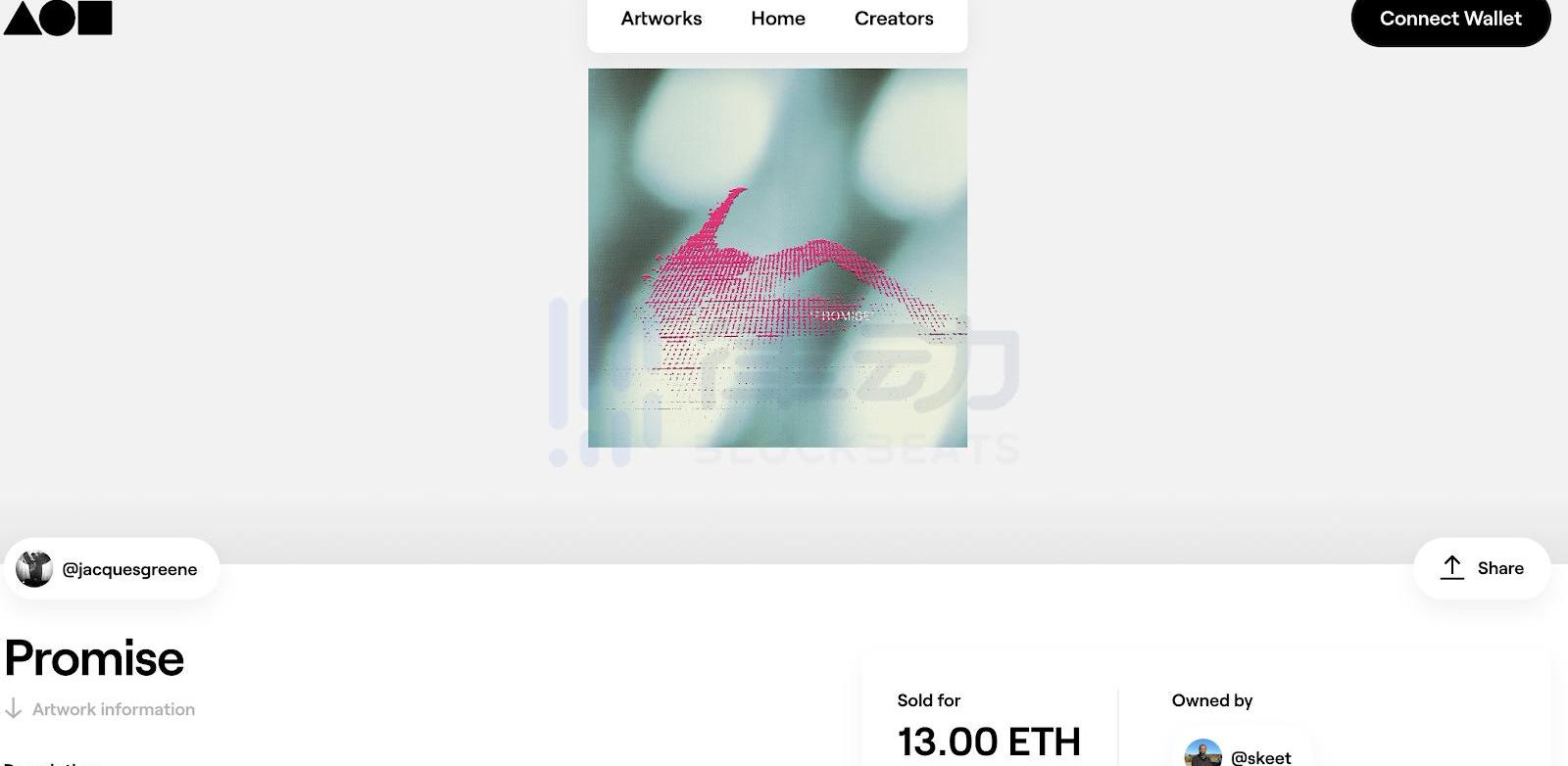 以電子音樂人JacquesGreene為例。他2011年發行的歌曲《AnotherGirl》在Spotify上有700萬次的播放量,讓他從平臺上凈賺了約27,904美元的版稅。上周,他以13ETH的價格賣出了一個令人著迷的音頻循環和GIF,是一個名為「Promise」的由斑點組成的人物。這個6秒鐘的視頻在24小時循環競拍中的收入幾乎是版稅的一半。