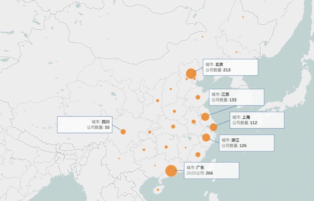 其中,公司數量最多的5個省份分別是廣東、北京、江蘇、浙江和上海。其余的27個省份公司數量均不超過100家。