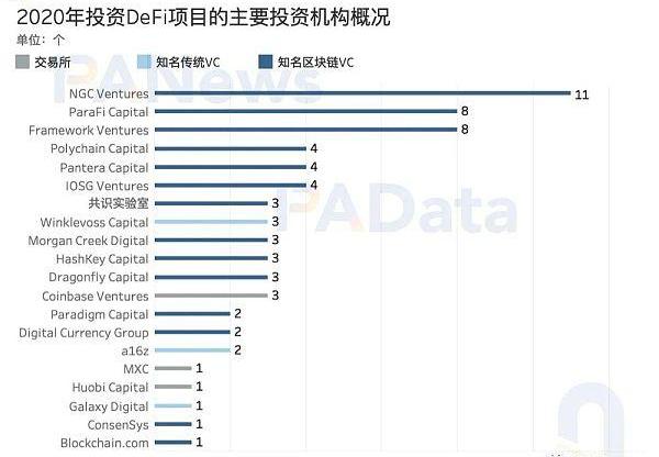 縱觀DeFi領域的投資,NGCVentures投資的項目數量最多,共有11個,其次是ParaFiCapital和FrameworkVentures,共投資了8個項目。偏傳統背景的投資機構中僅WinklevossCapital、a16z和GalaxyDigital投資了DeFi項目,交易所中,Coinbase、MXC抹茶和Huobi都布局了DeFi項目。