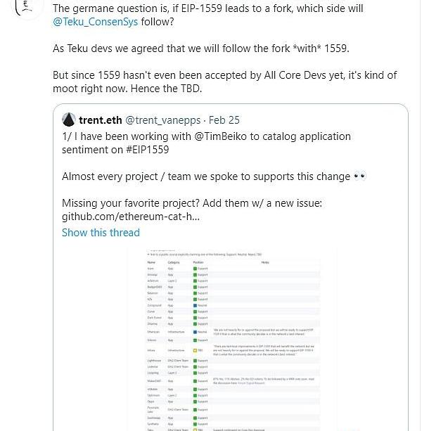 對于Teku的TBD(待決定),Teku團隊負責人BenEdgington表示如果分叉的話,Teku開發團隊會選有1559的鏈,但由于1559還未在AllCoreDev里通過,因此是TBD。