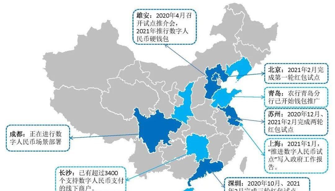 2020年4月19日,中國人民銀行數字貨幣研究所相關負責人表示,目前數字人民幣研發工作正在穩妥推進,先行在深圳、蘇州、雄安新區、成都及未來的冬奧場景進行內部封閉試點測試,以不斷優化和完善功能;2020年11月24日,據財新網消息,數字人民幣新增上海、長沙、海南、青島、大連、西安六地試點。目前,數字人民幣試點已經形成“十地一場景”的格局。除了深圳、蘇州、北京三地已經完成多輪試點外,其余城市都在積極進行數字人民幣試點的相關布局。