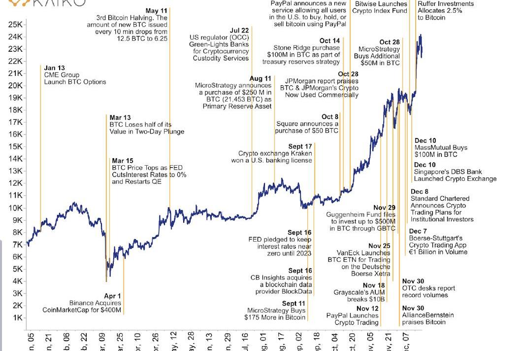 機構被認為是目前比特幣牛市的主要推動者。圖4展示了過去一年里發生在加密資產市場里的機構性事件,這些事件主要集中在今年最后三個月。隨著一家家新的數字資產公司宣布將比特幣納入其資產配置中,比特幣的增長勢頭也越來越強,甚至其年初至今的漲幅已經超過460%,而與之相比,傳統金融資產的回本速度有所下降。