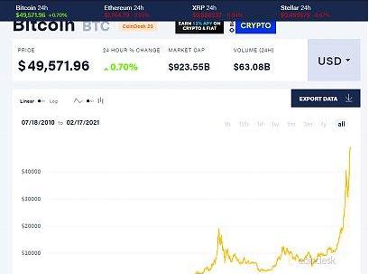 2021年2月第二周,特斯拉、萬事達卡和紐約梅隆銀行先后入局比特幣,主流機構的加持助推比特幣從年初至今累漲近7成。根據CoinDesk上顯示的比特幣的價格走勢,比特幣在2020年10月初只有1萬美元的價格水準,去年12月份躍上2萬美元這一平臺后,突然加速上飆,在兩個月多的時間內,翻了一番有余,達到了讓人瞠目的5萬美元。