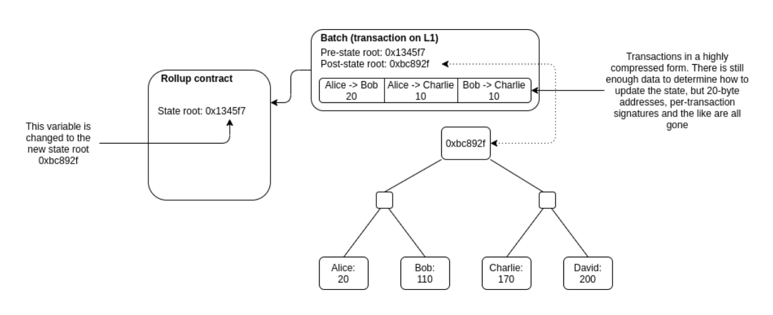 鏈上有一個智能合約,它維護狀態根:匯總狀態的Merkle根(意思是,“余額”內的帳戶余額,合約代碼等)。