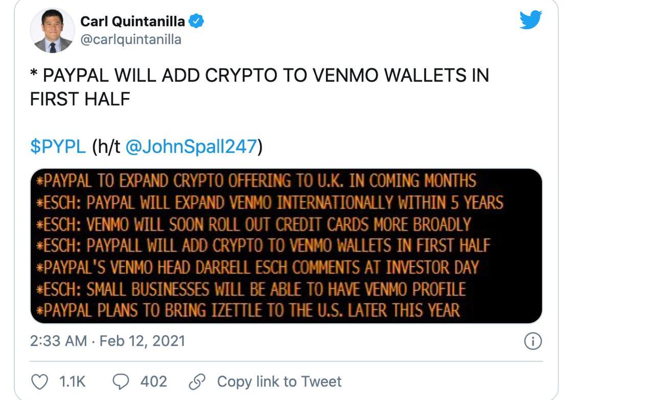 PayPal首席執行官丹·舒爾曼表示,在上周的第四季度財報電話會議上,PayPal決定將在2021年為“Venmo和精選的國際市場”增加加密貨幣的購買,出售和托管功能。但是,尚不清楚哪個市場將優先推出。舒爾曼說,在推出加密服務發現“超預期”之后,該公司正在“大量投資”加密資產,區塊鏈和數字貨幣業務。