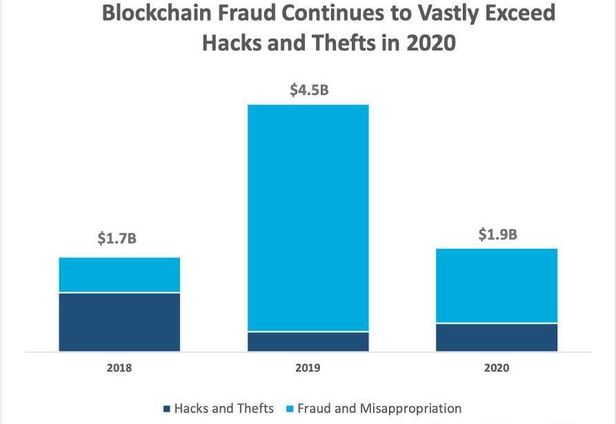 美國加密貨幣情報公司CipherTrace的2020年加密貨幣犯罪和反洗錢報告顯示,2020年,重大的加密貨幣盜竊,黑客攻擊和欺詐總額達到19億美元,是有史以來加密貨幣犯罪價值的第二高年度。2020年加密貨幣犯罪比2019年下降了57%,從45億美元下降到2020年的19億美元。