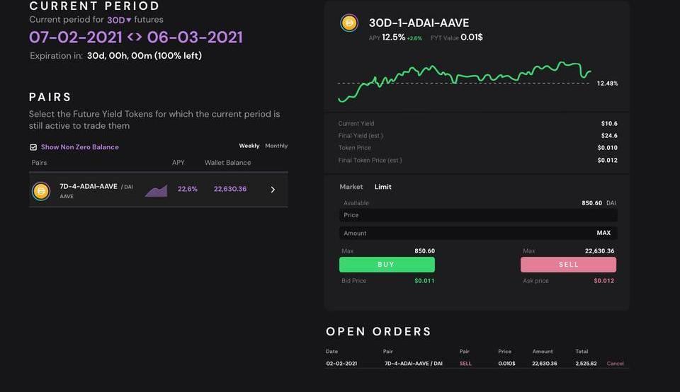 舉個例子,aDAI是用戶將DAI抵押在Aave平臺中的生息代幣,其收益率是根據DAI在該市場的需求不斷變化的。為了降低這個收益率的不確定性,用戶就可以使用APWine將收益權剝離為獨立的代幣,然后進行交易或賣出。
