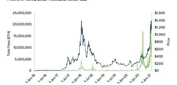 由于ETH是支付這些費用的商品,因此高昂的費用推動了對ETH的需求,就像旅行的增加可能推動對汽油的需求一樣。值得注意的是,2021年1月的總交易費用幾乎是2018年1月峰值費用的5倍。然而,ETH的價格幾乎與2018年的峰值價格持平。