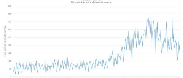 在2020年上半年,通過驗證的新智能合約數量穩定。第三季度,它與DeFi和流動性挖礦都表現出顯著的增長。通過驗證的單日新增智能合約數在11月達到頂峰,之后隨著ETH價格上漲而下降。