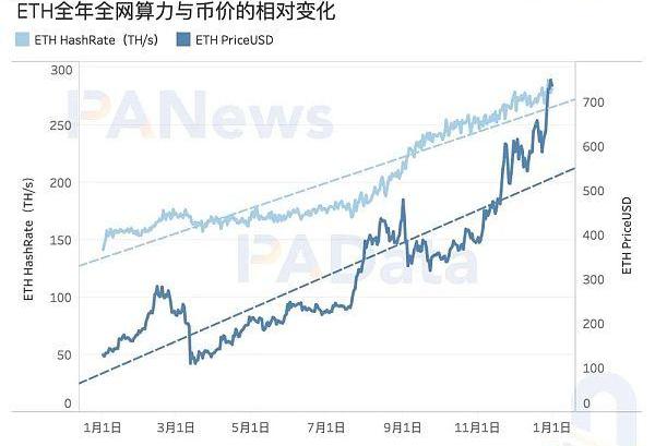另一方面,ETH挖礦難度大幅上漲同樣也是全網算力大幅提高的體現。根據統計,2020年以太坊全網算力從年初的141.55TH/s上漲至年末的281.37TH/s,全年漲幅約為98.78%。與2019年下跌10.54%相比,2020年以太坊全網算力大幅上漲,礦業基本面有了很大的改善。