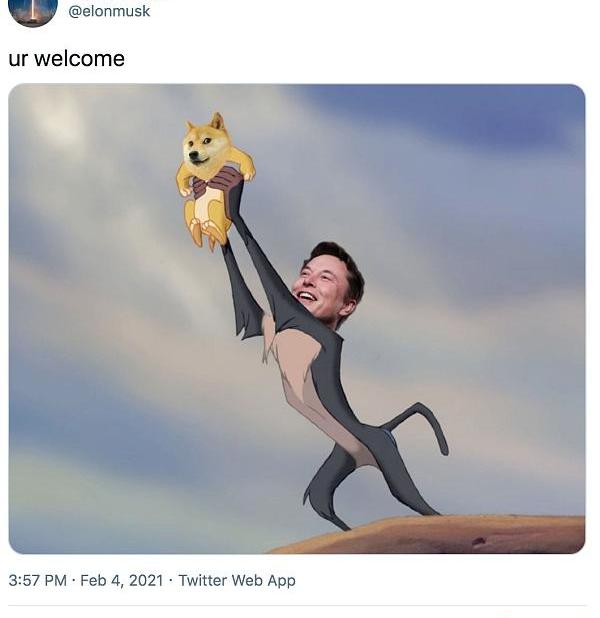 2月4日下午4點,當Dogecoin已從6天前的0.082美元高點回落?50%至0.04美元時,埃隆·馬斯克在推特上發了一張惡搞經典電影《獅子王》的圖,并配文“不用謝”。