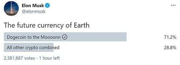 2月6日中午,馬斯克更直白地表達了自己想法,他發起了一個投票:地球未來的流通貨幣是哪個?Dogecoin,還是所有其他的加密貨幣?