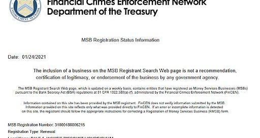 做一個不受監管的金融機構并不是一種罪過。有許多經營良好和合法的貨幣服務企業并不在任何特定的金融監管框架下運作。然而,如果一家金融機構聲稱其金融是受監管的,并以FinCEN的注冊作為證據,而事實上它并沒有遵守任何特定的金融監管框架,那么,這就是一種罪惡,這就是虛假廣告。