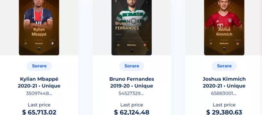 2020?年11月10?日以來,Sorare游戲中最昂貴的球員卡如下圖顯示,均是稀有等級為unique的球員卡。其中排名第一的球員卡高達65,713.02美元。卡面主角基利安·姆巴佩,1998年12月20?日出生于法國,職業足球運動員,場上司職前鋒,效力于法國足球甲級聯賽的巴黎圣日耳曼足球俱樂部。2018年,基利安·姆巴佩入選法國國家隊2018年俄羅斯世界杯最終名單并隨隊獲得冠軍及2018年俄羅斯世界杯最佳新秀獎。