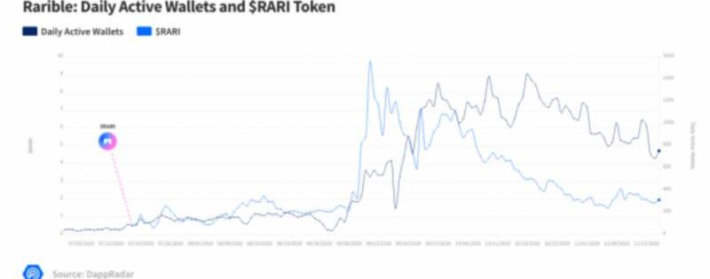 目前,NFT社區已經采用了流動性挖礦。Rarible是最早跟進的dapp之一,每周都會以RARI代幣的形式向賣家和買家發送獎勵。如下圖所示,自從RARI推出后,每日活躍錢包以及RARI代幣的價格都經歷了波動。