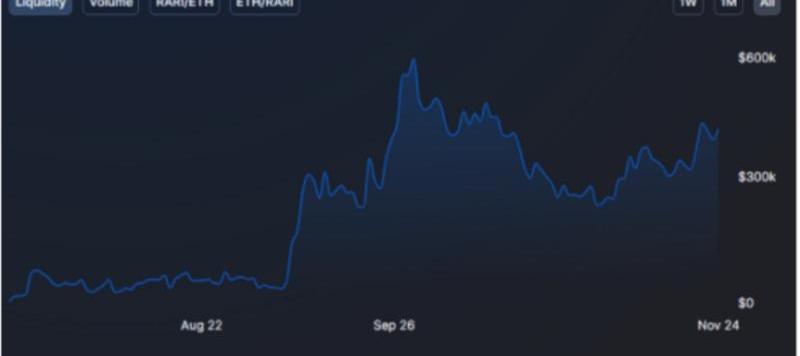 下圖是流動性池RARI/ETH成立至今的發展情況。可以看到截止11月底,共有299個ETH和84821個RARI代幣,這意味著用戶可以輕松兌換每周的空投代幣,而不會導致價格出現大的滑落。?