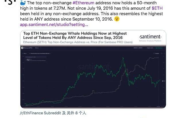 鯨魚最高不交換#ETH地址現在持有50個月以來最高的7.27m的代幣。自2016年7月19日以來,沒有一個地址有這么多的代幣$ETH此舉類似自2016年9月10以來任何一個地址的最高持有量。