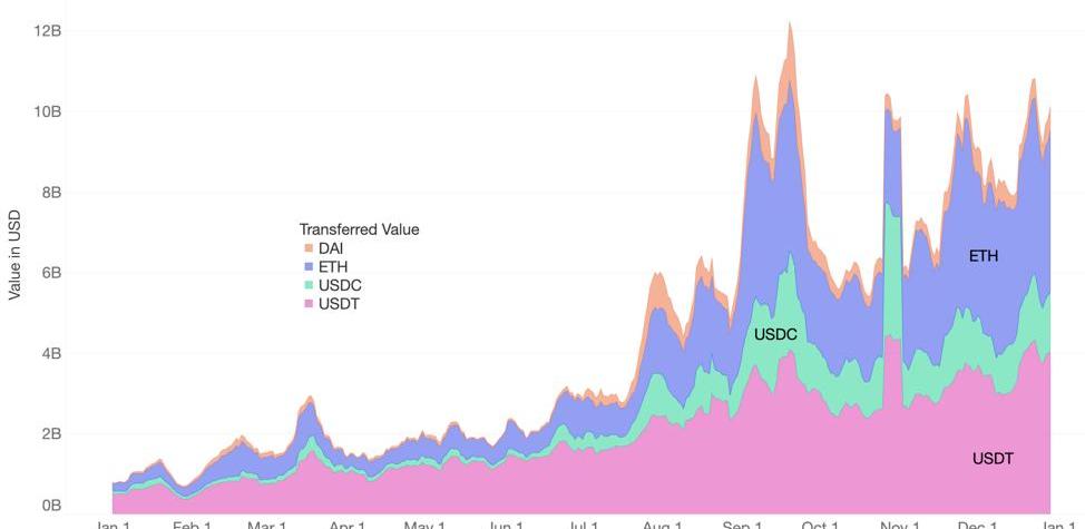 2020年以太坊上ETH、DAI、USDC、USDT的已結算交易量。來源:CoinMetrics