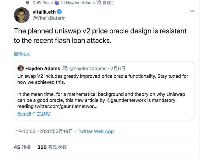 2月19日,在bZx連遭攻擊之后,關于“預言機”、“閃電貸”、“管理密鑰”的討論已變得越來越多,DeFi生態正在經歷一個短暫的痛苦期。對此,以太坊聯合創始人VitalikButerin不得不在Twitter上站出來維穩,稱:“Uniswapv2預言機設計,能夠抵御閃電貸攻擊。”