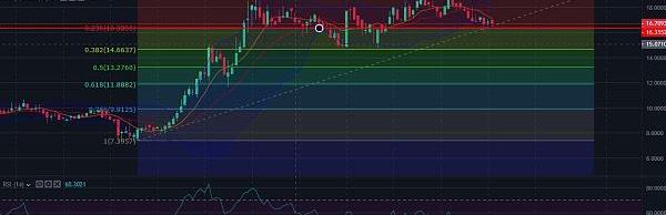 在一個持續了5天的巨大反彈之后,DOT價格現在準備進行修正,以恢復健康的長期反彈。DOT回撤至23.8%的斐波那契水平16.30美元。