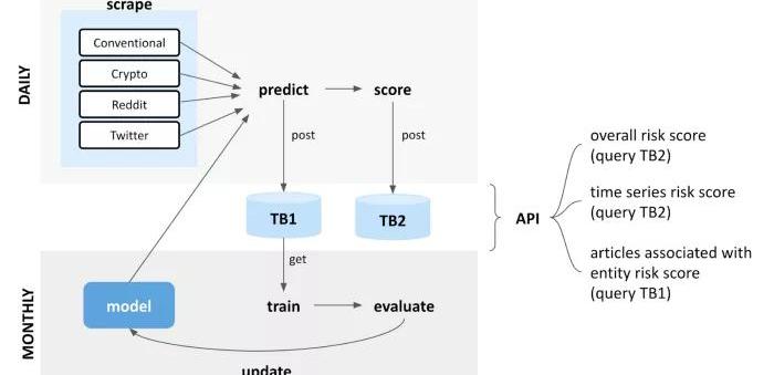 RoBERTa模型對新聞文章或社交媒體帖子的文本進行處理,并為特定文本分配一個風險分數。由于該文本在數據收集過程中已經被標記為實體,我們現在已經有了加密實體的相關風險指標。在后期,我們將多個文本的風險分數結合起來,給出一個實體的整體風險分數。
