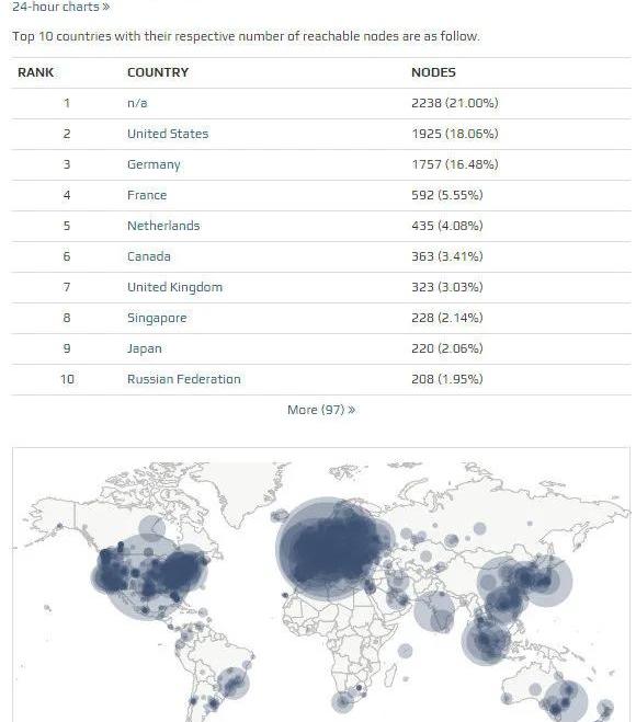 這使得比特幣在驗證和共識方面高度去中心化。雖然挖礦能力集中在某些國家,但比特幣去中心化的一個主要來源在于它在整個節點之間的共識框架。每個完整的節點可以重建整個比特幣區塊鏈,它們在世界各地運行。這里有一張地圖,它是網絡可見的: