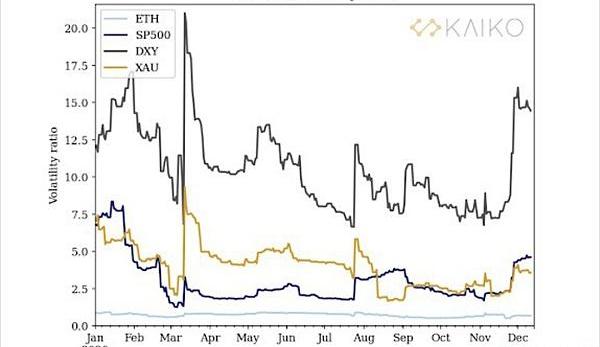圖2:主要加密資產的波動率(BTC/美元和ETH/美元匯率)、市場回報率(標普500指數)、美元指數(DXY)和黃金(XAU)