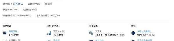 BCH作為四大主流幣之一,一直備受關注。根據BTC.com瀏覽器,目前BCH的總市值為637.21億占加密貨幣總市值的0.92%,長期位于市值前十。?BCH的24小時交易數148707,活躍地址數101308。