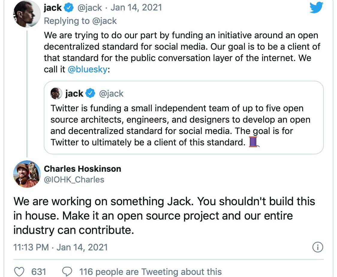 推特首席執行官杰克·多爾西在他自己的社交媒體平臺上解釋了最近禁止美國總統唐納德·特朗普使用推特賬號的原因,他在推特的BlueSky計劃上展開了討論,該計劃旨在以推特為客戶,為社交媒體開發一種開放和去中心化的標準。以太坊的聯合創始人V神也加入了討論,它同查爾斯·霍斯金森共同敦促多爾西將BlueSkye計劃開源,讓社區做出貢獻。