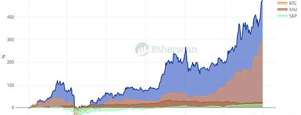 ETH的表現超過了BTC、黃金和標準普爾500指數等主要資產。截止2020年底,ETH的漲幅為483%,不僅打敗了BTC,還令黃金和標準普爾500指數望塵莫及。