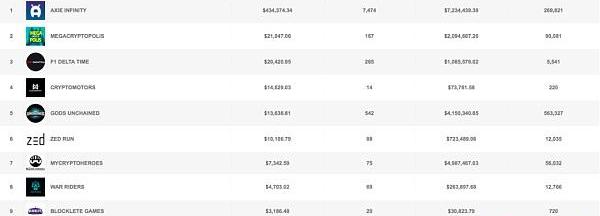 根據NonFungible.com,過去一周排名前十的區塊鏈游戲排名