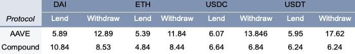 在大多數用例中,AAVE協議的使用成本都高于其它借貸協議。dYdX是一致性最高的協議,代幣的存入和取出交易所需消耗的gas量相差無幾。Compound在ETH存款交易方面的成本最低,而且在USDT的存入和取出交易方面的成本均低于AAVE。