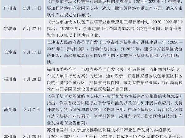 2019年10月24日,中共中央局就區塊鏈技術發展現狀和趨勢進行第十八次集體學習,中共中央總書記習近平在主持學習時強調:區塊鏈技術的集成應用在新的技術革新和產業變革中起著重要作用,我們要把區塊鏈作為核心技術自主創新的重要突破口,明確主攻方向,加大投入力度,著力攻克一批關鍵核心技術,加快推動區塊鏈技術和產業創新發展。2020年4月20日,國家發改委明確了新基建的范圍,“區塊鏈”正式被列入新型基礎設施中的信息基礎設施,標志著國內區塊鏈產業發展將迎來新一輪變革。頂層設計逐步明確完善后,2020年以來,各級政府對于區塊鏈產業的扶持力度進一步加大,產業園區的建設以及優惠政策的實施都有了長足進展。