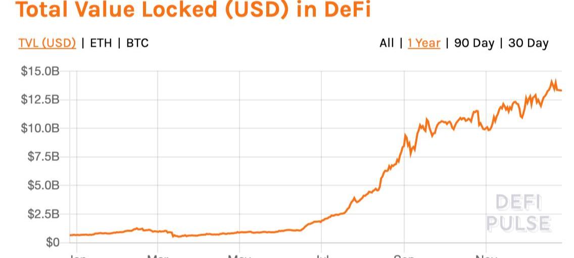 躊躇滿志,市值超過5億美元。比賽似乎才剛剛開始。在撰寫本文時,DeFi鎖定的總價值為138億美元,略低于其12月19日創下的紀錄高點140億美元。