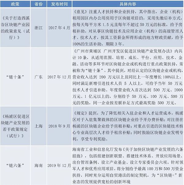 政府主導的產業園區在成立之初往往伴隨著優惠政策的出臺。2017年4月,杭州市西湖區政府出臺了《關于打造西溪谷區塊鏈產業園的意見(試行)》,在區塊鏈產業園政策上首開先河。之后由廣州市黃埔區制定的“鏈十條”和海南省自貿區出臺的“鏈六條”也都是針對區塊鏈產業園區發展有代表性的政策。