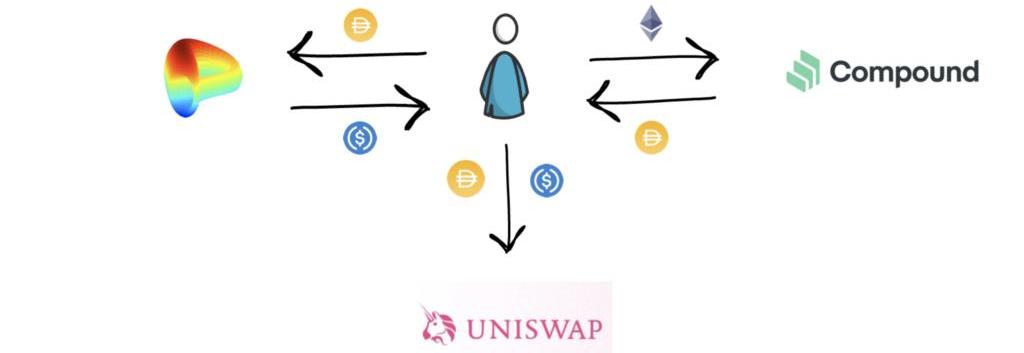 讓我們想象一下,Uniswap和Curve之間的DAI/USDC池存在價格差異。你可以在Curve上用1個DAI換取1個USDC,但在Uniswap上您只需要0.99個DAI就可以買到1個USDC。現在你可以嘗試執行以下套利: