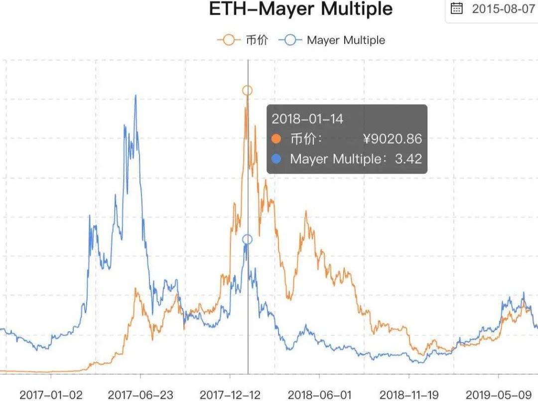 在2018年1月14日以太坊價格到達9020元時,Mayer指數為3.42。