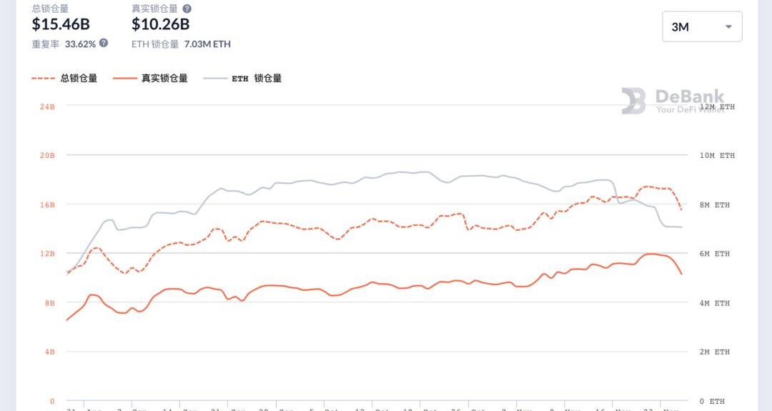 DeFi是以太坊生態的旗艦。根據DeBank數據,在11月中旬DeFi總鎖倉量突破新高之后,近日DeFi產品的鎖倉量有所回落。