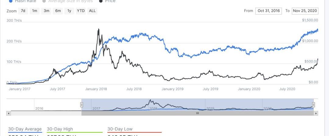 圖中數據顯示了以太坊Hash算力情況,可以看到在過去半年內,以太坊挖礦算力持續增加,從六月下旬的176TH/s上升到目前的266.38TH/s,TH/s表示每秒鐘可以運行的hash運算的量,表示算力值的大小。