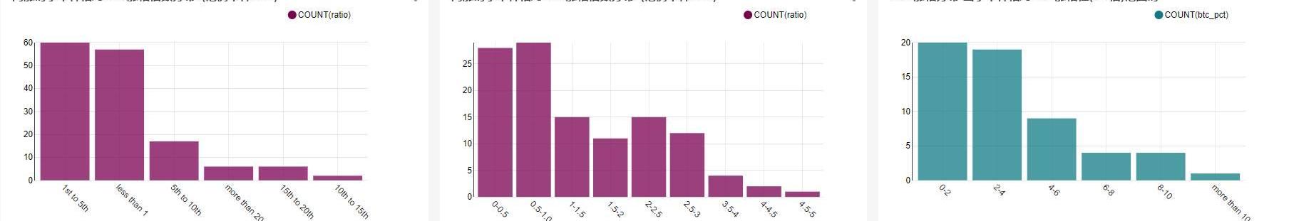(2)小幣種的跟漲跟跌幅度大于主流幣,牛市購買小幣種更有優勢。主流幣、小幣種與BTC同漲同跌時,漲跌幅分布漲幅倍數的分布情況
