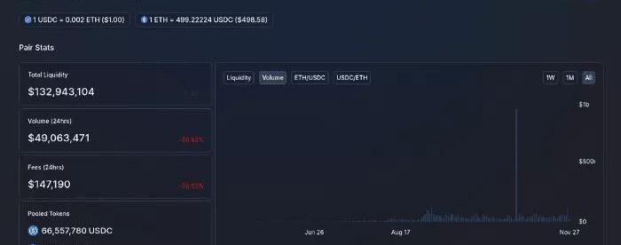 在上圖中,我們可以看到,USDC-ETH池的14.7萬美金的交易費用是由流動性提供者共享的。也就是說,如果我一共提供了1萬美金的流動性,那么我一天就能賺到約11美金的收益。而若把這一收益推算成一年的話,我們提供流動性的收益率就能達到40%左右。