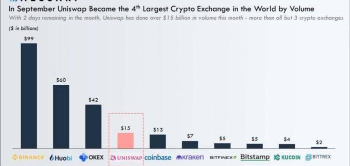 2020年已經顯示出DeFi用無權限智能合約取代中心化金融服務的力量,Uniswap等自動化做市商對中心化交易所及其訂單簿模式的成功就說明了這一點。2020年9月,Uniswap成為按交易量計算的第四大加密貨幣交易所。人們無法在像Uniswap這樣的DEX上刷量,因為以太坊區塊鏈上的交易費用使得偽造交易量的做法不可行。