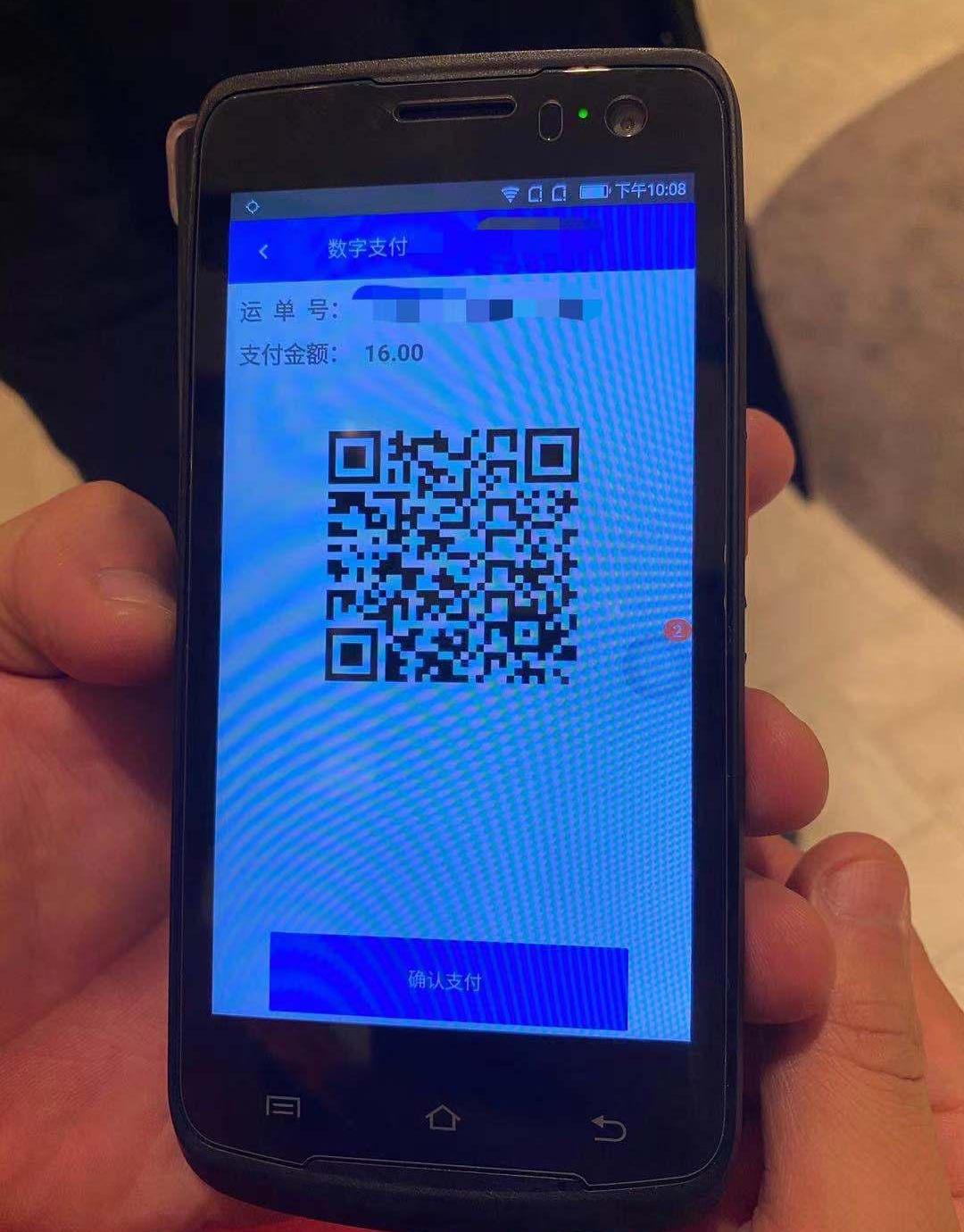 一位京東快遞小哥對澎湃新聞記者表示,其使用的手機叫做工業一體機,掃描貨號會出現訂單信息,現在訂單信息的界面下方出現了數字支付這一選項,一旦點擊就會出現具體的收款碼界面,客戶用數字人民幣錢包掃碼即可付款。