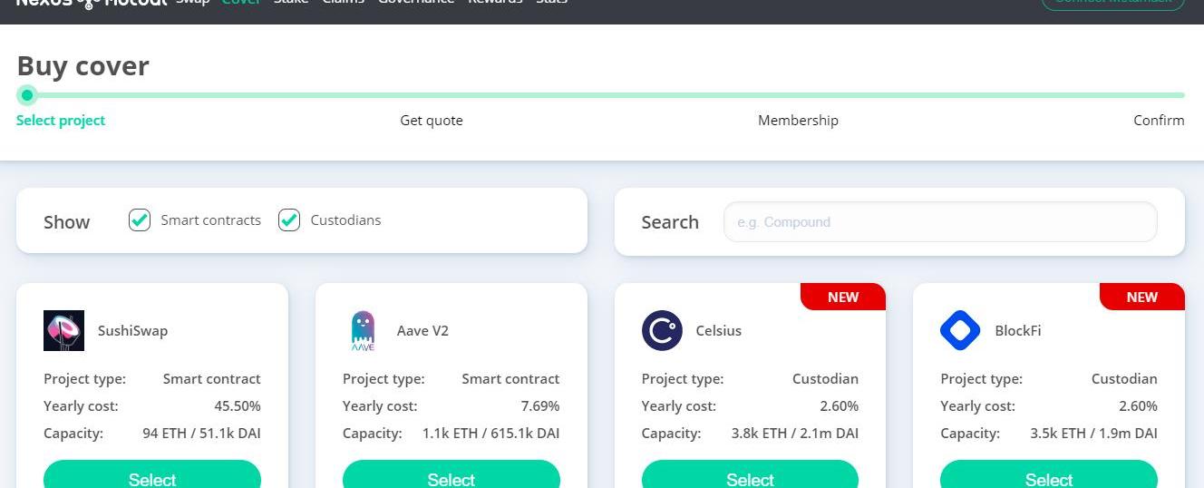 在NexusMutual官網,投保人可以使用ETH或者DAI為特定項目投保,目前支持64個項目,比其他保險協議豐富很多。NexusMutual引入了“去中心化風險評估”機制,與投保人相對應的“承保人”叫做風險評估師,往往是智能合約安全性審計專家,他們將通過質押代幣的方式參與特定風險的評估,賺取系統給予的代幣獎勵。